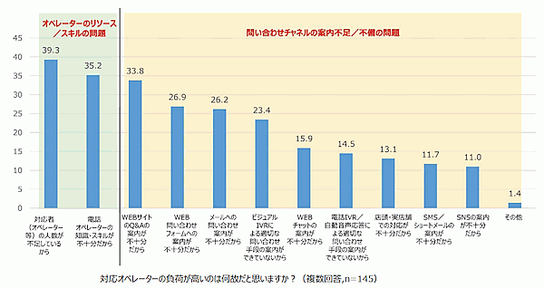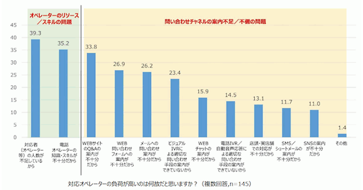 さらに、「所属部署で管理・運用されている顧客対応で、問い合わせ対応によるオペレーター等の作業負荷は高いか?」と聞くと、「とても高い+やや高い」は58.0%。その理由においては、「対応オペレーターの人数不足」「対応オペレーターの知識・スキルが不十分」が上位となった。