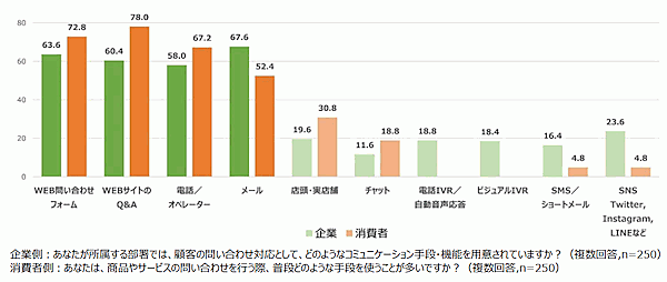 まず企業側に「顧客の問い合わせ対応として、どのようなコミュニケーション手段・機能を用意しているか」、消費者側に「問い合わせを行う際、ふだんどのような手段を使うことが多いか」を聞くと、企業側は「メール」67.6%、「Web問い合わせフォーム」63.6%、「WebサイトのQ&A閲覧」60.4%が上位だったが、消費者側は「WebサイトのQ&A閲覧」78.0%、「Web問い合わせフォーム」72.8%、「電話/オペレーター」67.2%が上位だった。