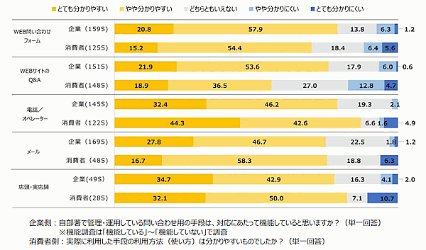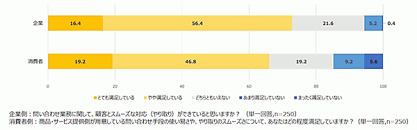 また企業側に「問い合わせ業務に関して、顧客とスムーズな対応(やり取り)ができていると思うか?」と聞くと、「対応できている+やや対応できている」は72.8%だったが、消費者側に「問い合わせ手段の使いやすさや、やり取りのスムーズさについて、どの程度満足しているか?」と聞くと、「とても満足している+やや満足している」は66.0%とやや下回っていた。
