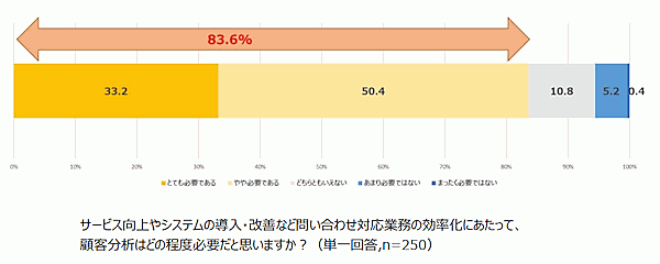 企業側に「サービス向上やシステムの導入・改善など問い合わせ対応業務の効率化にあたって、顧客分析はどの程度必要だと思うか?」と聞くと、「とても必要である+やや必要である」83.6%だったが、「顧客対応業務に当たって、サービス向上やシステム・体制など改善希望や検討事項はあるか?」と実際の状況を聞くと、顧客分析を行っている企業は55.6%とやや下回っていた。