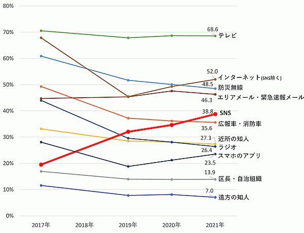 また「SNS」との回答が急増しており、今回は38.8%で5位。2017年調査では20%未満で9位だったが、この4年でほぼ倍となった。