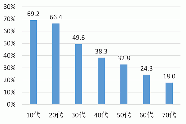「SNS」との回答について年代別で見ると、10代:69.2%、20代:66.4%は6割を超えており、テレビを抜いていたという。普段から使っているメディアであること、テレビを持っていない割合が増えていることなど背景として考えられる。また、全体で2位の「インターネット」は、10代、さらには60代・70代ではトップ3に入っていないのも興味深い点だ。