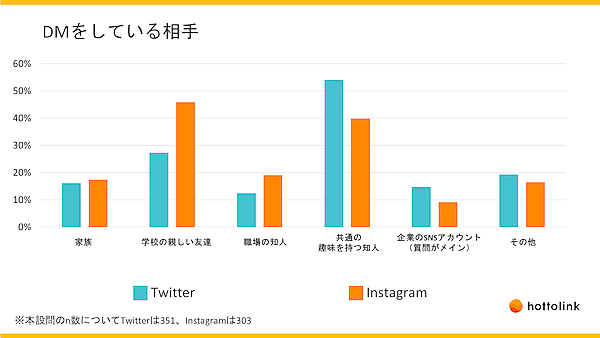 DMを送る相手、Twitterは「共通の趣味を持つ知人」「企業」、Instagramは「友達・知人」