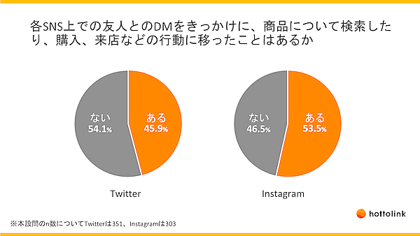 そこで、DM利用経験者(Twitter351人、Instagram303人)に「友人とのDMをきっかけに、商品について検索、購入、来店などの行動に移ったことはあるか」と聞くと、Twitterでは「ある」が45.9%、Instagramでは「ある」が53.5%となり、約半数がDMきっかけで行動していた。