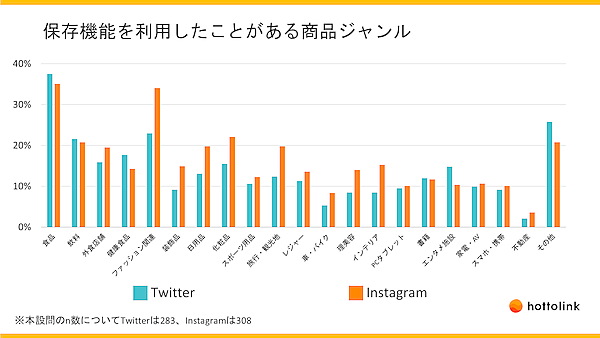 そこで保存機能の利用経験が「ある」と回答した人(Twitter283人、Instagram308人)に、「保存機能を利用したことがある商品ジャンル」を聞くと、どちらも1位は「食品」だったが、2位の「ファッション関連」はInstagramがTwitterの利用頻度を大幅に上回っている。その他「化粧品」「日用品」「旅行・観光地」なども、InstagramがTwitterをかなり上回っている。