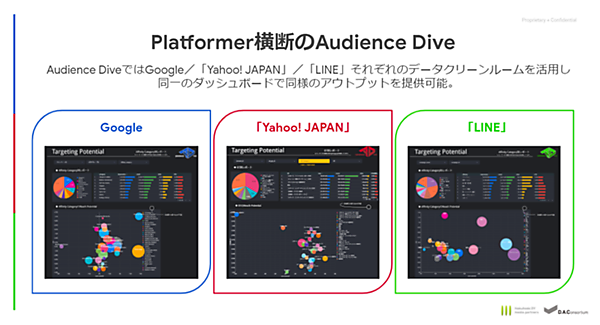 Audience Diveは、各プラットフォームが提供する安全にデータ比較できるデータクリーンルームや広告配信データを活用。配信時の設計にとらわれない自由度の高い広告プラニングができる。Yahooのデータクリーンルーム「Cocoon」はAd(広告)データとAd関連以外のYahooサービスデータにアクセスでき、LINEの広告配信データは「LINE広告」やLINE公式アカウントのデータを活用した広告分析が可能な環境で、今回追加された。