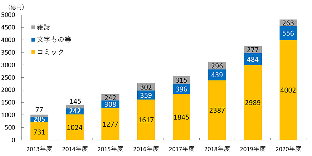 電子書籍市場規模のうち、「コミック」ジャンルに限ると、市場シェア83.0%で4,002億円(前年度から1,013億円増)。「文字もの等(文芸・実用書・写真集等)」ジャンルは、市場シェア11.5%で556億円(同72億円増)となっている。
