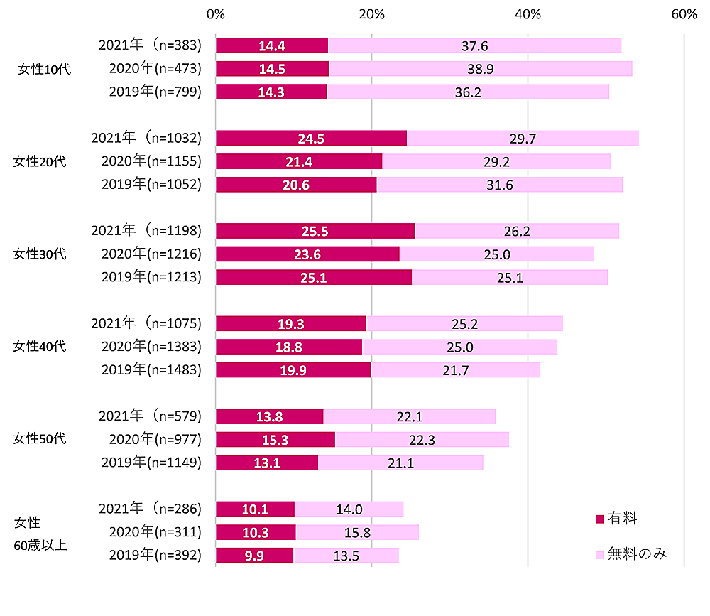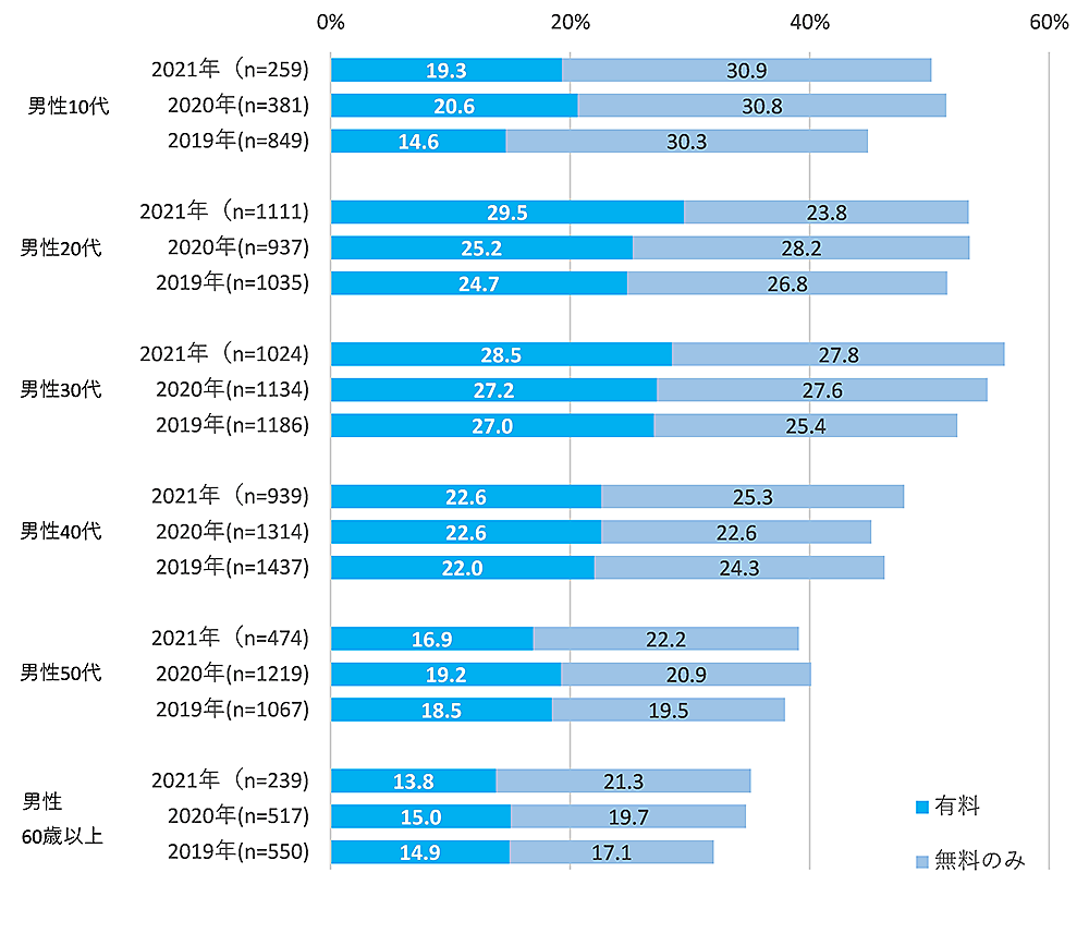 性・年代別で「電子書籍の利用率」を見ると、男性は前年と同じく「30代」が最多だったが、女性は「30代」から「20代」が最多に変わった。また有料サービスの利用が男女ともに、10代・50代・60代以上で減少を見せた。