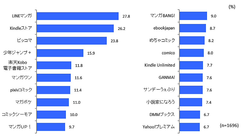 「利用している電子書籍サービス・アプリ」では、「LINEマンガ」27.8%、「Kindleストア」26.2%でトップが前年から入れ替わった。また3位の「ピッコマ」23.8%(前年15.1%)が大幅に利用率を伸ばしている。