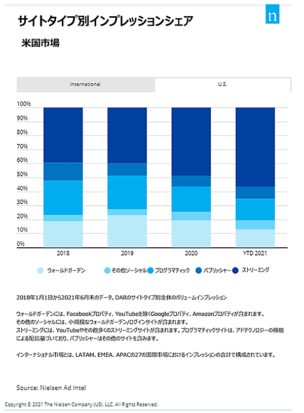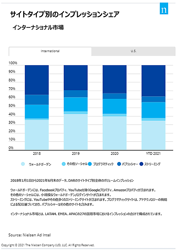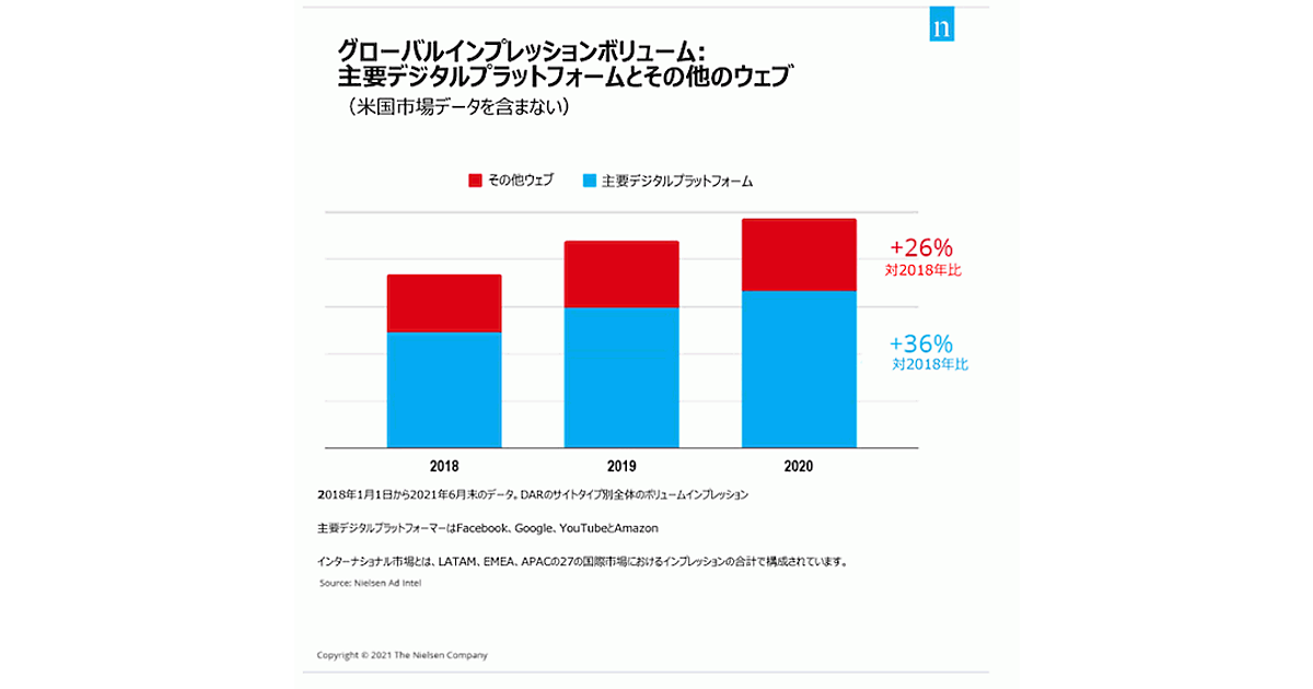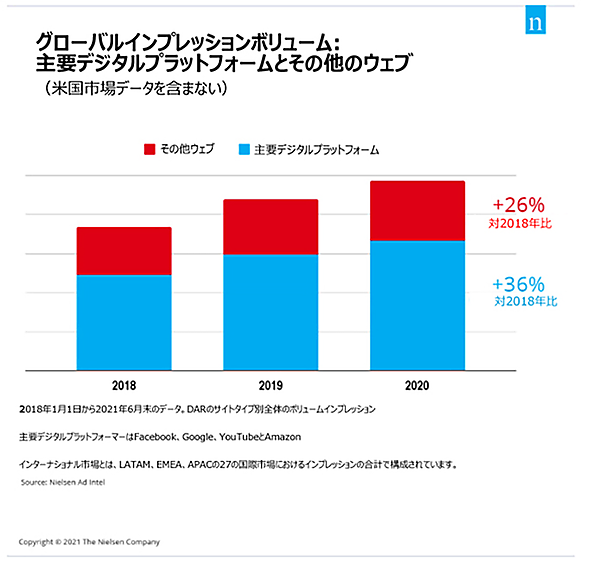 ニールセン デジタル広告視聴率のデータによると、米国以外(ラテンアメリカ、EMEA、アジア太平洋地域)の27か国において、デジタルインプレッションは大幅に増加していた。Facebook、Google、YouTube、Amazonといった主要プラットフォームのデジタルインプレッションは、この2年間で36%増加、それ以外のプラットフォームでも26%増加していた。