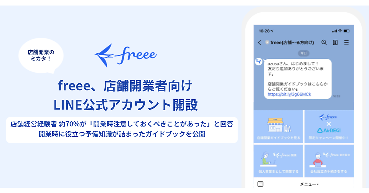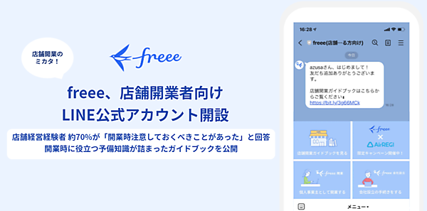 クラウド会計ソフトのfreee(フリー)は、飲食店や小売店などの店舗を開業する人に向けた「LINE公式アカウント」を開設した、8月20日に発表した。「freee(店舗をOPENされる方向け)」のLINE公式アカウントを友だち追加すると、店舗開業経験者による体験談を交えた「初めての店舗開業ガイドブック」を閲覧することができ、開業や会社設立の手続きの準備をfreeeの公式LINEアカウントから始めることができる。