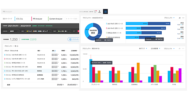 PRソリューション事業のビルコムは、同社のクラウド型PR効果測定ツール「PR Analyzer」に、さまざまなPR活動(プロジェクト)ごとにメディア掲載記事を表示・分析する「プロジェクト集計機能」を加えた、と8月23日発表した。活動ごとの成果分析やレポーティングが効率化する。PR Analyzerを導入している企業は、5プロジェクトまで追加課金なしで利用できる。