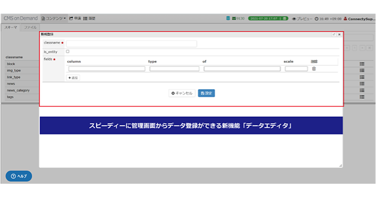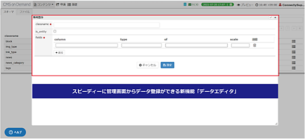 CMS(コンテンツ管理システム)開発・ウェブ戦略提案事業のコネクティは、同社の企業向けクラウドCMS「Connecty CMS on Demand(CMSoD)」を無償バージョンアップし、新機能「データエディタ」を加えた、と8月23日発表した。データエディタでスピーディーなサイト構築が可能になる。データエディタを搭載したCMSoD「バージョン2.11.0」の提供を8月17日に始めた。