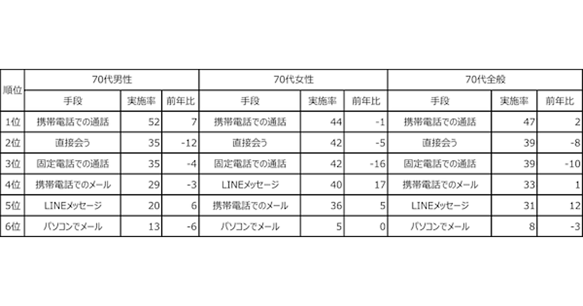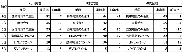 この傾向は70代もおおよそ同じで、「友人との連絡手段」を見ると、「固定電話での通話」39%から「携帯電話での通話」47%へ、そして「LINEメッセージ」31%にコミュニケーション手段が移行している。60代と比べると、前年よりは減少したが「直接会う」39%の比率が高いのも特徴的だ。