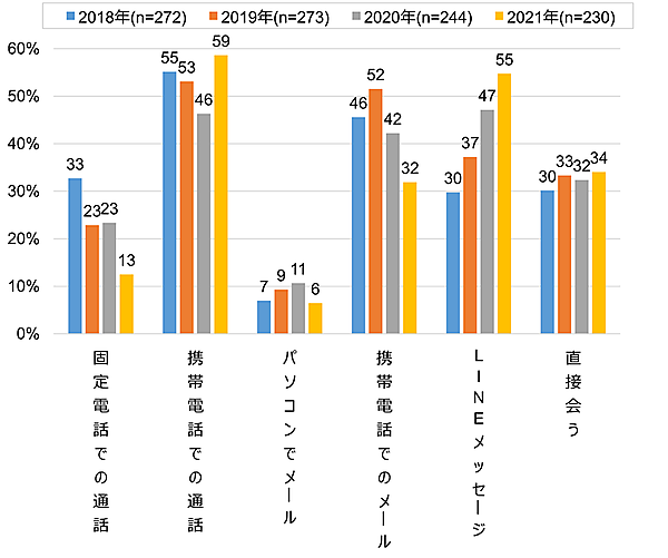 60代の「友人との連絡方法」の変化を見ると、「固定電話での通話」が2018年の33%から今回は13%まで大きく減少。同じ音声電話の「携帯電話での通話」は、今回は増加に転じ1位となった。シニア層へのスマホ普及が、メインの通話手段を変えたと考えられる。一方、「LINEメッセージ」も2018年の30%から55%と倍近く増加し、携帯電話での通話に次ぐ連絡手段になった。
