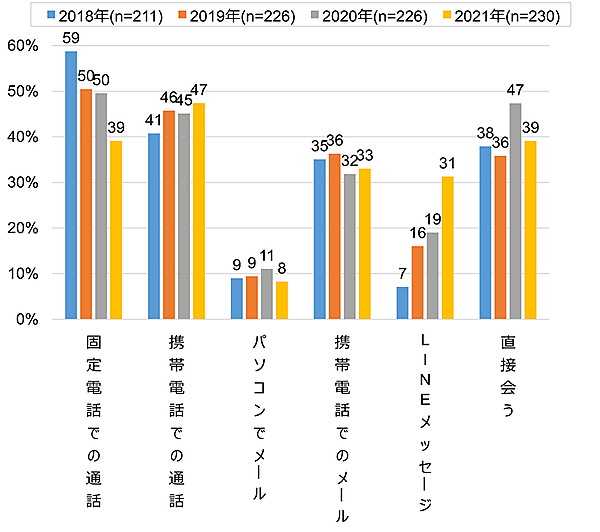NTTドコモ モバイル社会研究所は、「シニア(60代・70代)のICT利活用」について調査した結果を発表した。ここ数年の連絡手段の変化について、60~79歳男女508名から回答を得ている。