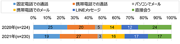 「友人との連絡手段でもっとも使っている手段」については、「携帯電話での通話」27%が最多ながら、こちらでも「LINEメッセージ」17%が3位まで上昇した。音声コミュニケーションや直接会うという人が多いながら、長引くコロナ禍で、手軽にやりとりが行え、写真などで近況を伝えやすいLINEが存在感を増しているようだ。