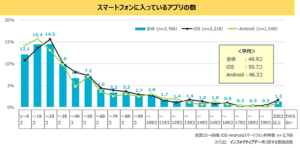 まず全体に「スマートフォンにインストールしているアプリの数」を聞くと、平均「48.9個」だった。「10個~19個」14.4%、「20個~29個」14.5%が特に多くボリュームゾーンとなっている。「39個以下」と区切ると50.9%と半数を超えている。OS別では、iOS端末は平均「50.7個」、Android端末は平均「46.3個」だった。
