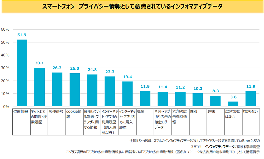 「スマートフォンのプライバシー設定を意識している」と回答した2,359人に、「もっとも意識しているインフォマティブデータ」を聞くと、「位置情報」51.9%が特に多く唯一半数を上回った。2位は「ネット上での閲覧・検索履歴」30.1%で、以下「郵便番号」26.3%、「cookie情報」26.0%、「使用している端末・ブラウザに関する情報」24.8%が僅差で並ぶ。