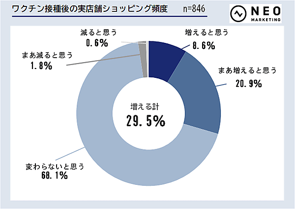 さらにワクチン接種意向のある人に「ワクチン接種後に行くと思うところ」を聞くと、これまでと比較して「アウトレットモール」68.5%増、「百貨店・デパート」33.5%増、「ショッピングモール」27.4%増と、大型施設が上位となった。また、「実店舗全体での買い物の頻度」についても、「変わらない」とした人が68.1%ながら、「接種後は増える」とした人が29.5%にのぼっている。