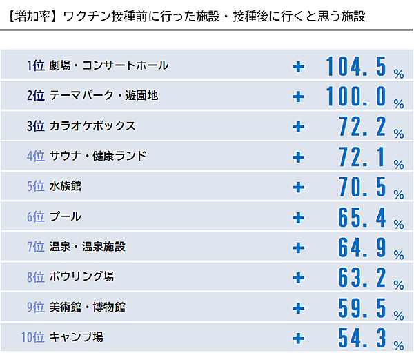 「ワクチン接種後に行くと思うレジャー施設」については、「劇場・コンサートホール」104.5%増がもっとも訪問意向が増加しており、「テーマパーク・遊園地」100.0%増がほぼそれに並んだ。