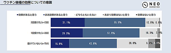 一方で「ワクチンの効果」そのものについては、2回接種済みの人で「効果があると思う+まあ効果があると思う」の合計は86.6%、1回接種済みでは81.2%、未接種では60.4%で、全体的な数値もあがるとともに、差が縮まっている。
