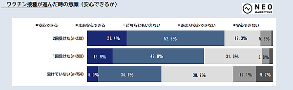 「今後ワクチン接種が広まったら、感染拡大前のように安心できるか」という質問については、2回接種済みの人で「安心できる+まあ安心できる」の合計は73.9%、1回接種済みでは62.9%、未接種では40.1%だった。