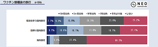 一方「旅行」については、3割以上が「半年以内に、国内旅行に行きたい」と回答したが、海外旅行については60.3%が「しない」と回答した。