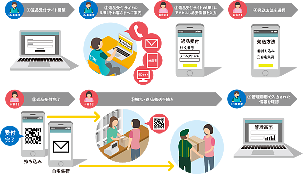 返品希望の顧客は、EC事業者に案内された返品受付サイトにアクセスし、注文番号とメールアドレス、商品受け取り日、返品理由、名前、住所などの情報を入力。発送方法を発送可能店舗への「持ち込み」か「自宅集荷」から選ぶと返品受付が完了する。持ち込みだと2次元コード付きのメールが送付され、商品をこん包して発送可能店舗で2次元コードを提示して返品する仕組みとなる。