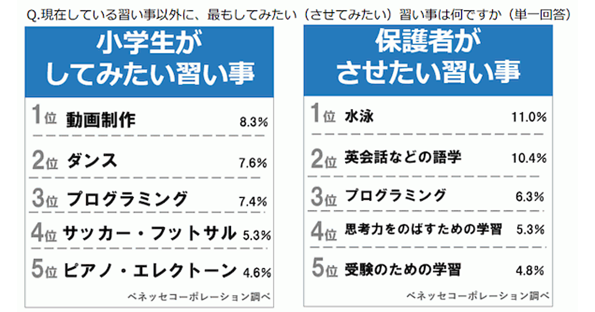 唯一「プログラミング」は、トップ5のなかで両者が一致した。プログラミングは、小学校の新課程が2020年度からスタートしており、子どもも親も気になる習い事だ。またYouTuber同様に、なりたい職業としても人気が集まっている。