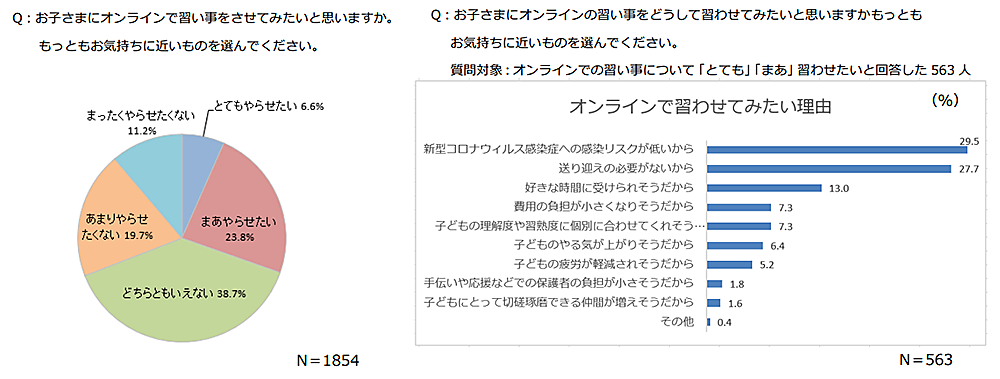積極的な理由としては「新型コロナウイルス感染症への感染リスクが低いから」29.5%と、「送り迎えの必要がないから」27.7%がトップ2で、「好きな時間に受けられそうだから」13.0%がそれに続いた。大人の世界の「テレワーク」は、想定以上の好評で広く受け入れられたが、「オンラインの習い事」はまだまだ様子見段階のようだ。