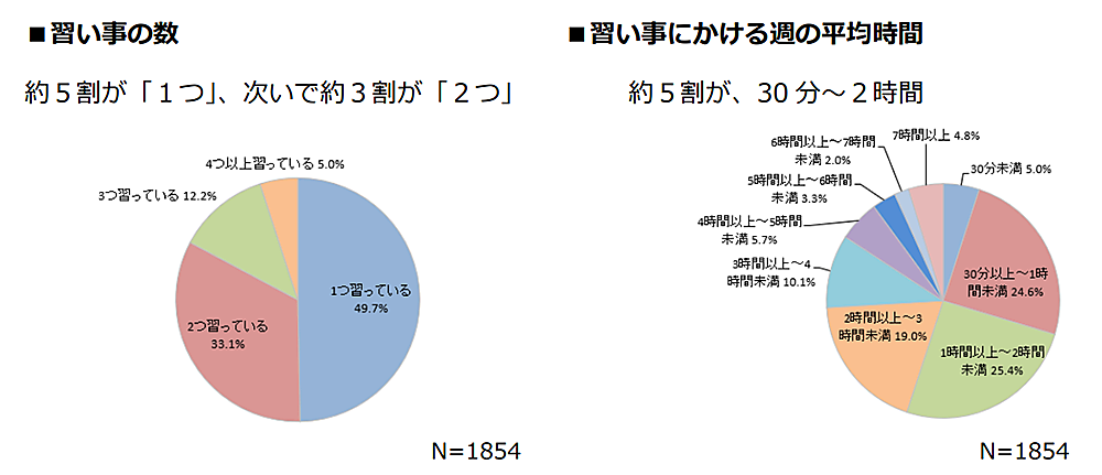 その他の調査結果を見ると、「有料の習い事をしている」のは全体の45%、「習い事の数」では49.7%が「1つ習っている」、33.1%が「2つ習っている」となった。「習い事にかける週の平均時間」は、「30分~2時間」で半数以上を占める。そして1か月あたりの習い事の平均費用は「13,680円」だった。
