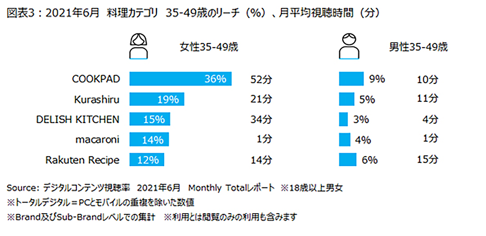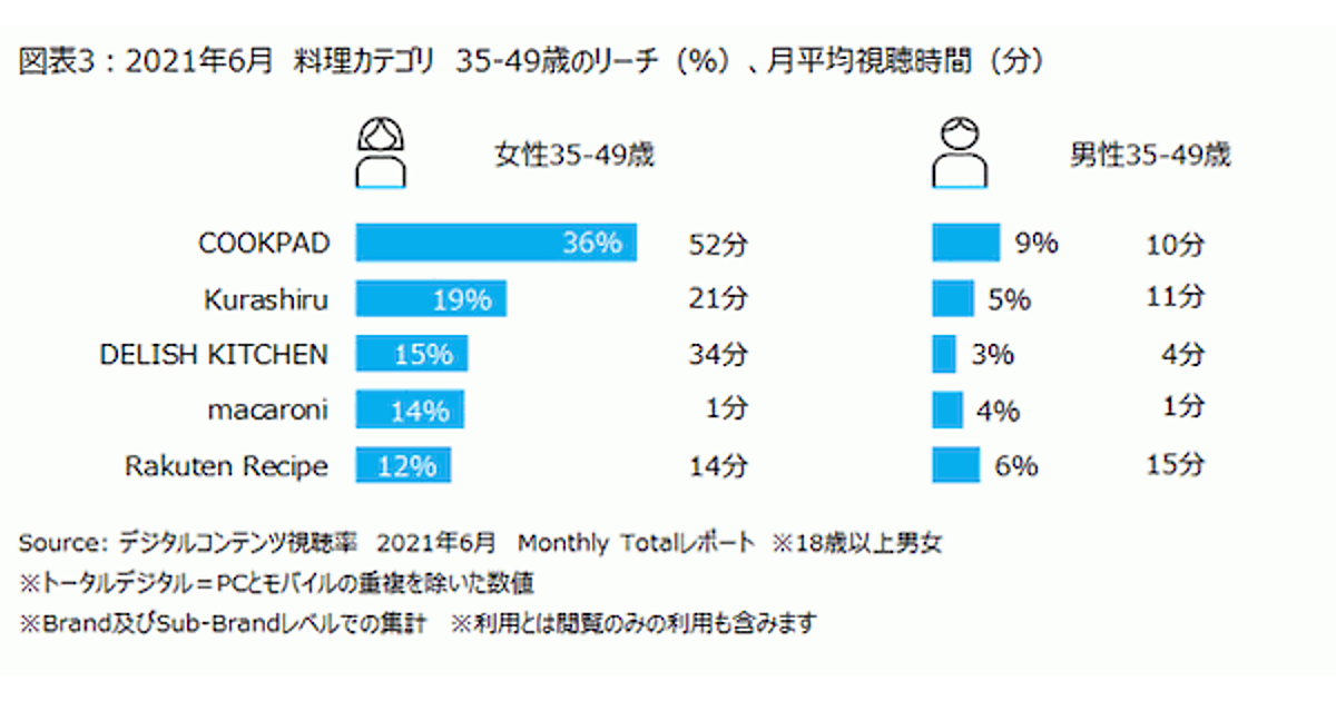 そこで個別のサービスについて、女性35~49歳および男性35~49歳についてみると、女性の「クックパッド(COOKPAD)」利用は、36%で月間52分に達しており、男性の10分の5倍近い。サービスの順位については、全体の視聴者数に一致する。