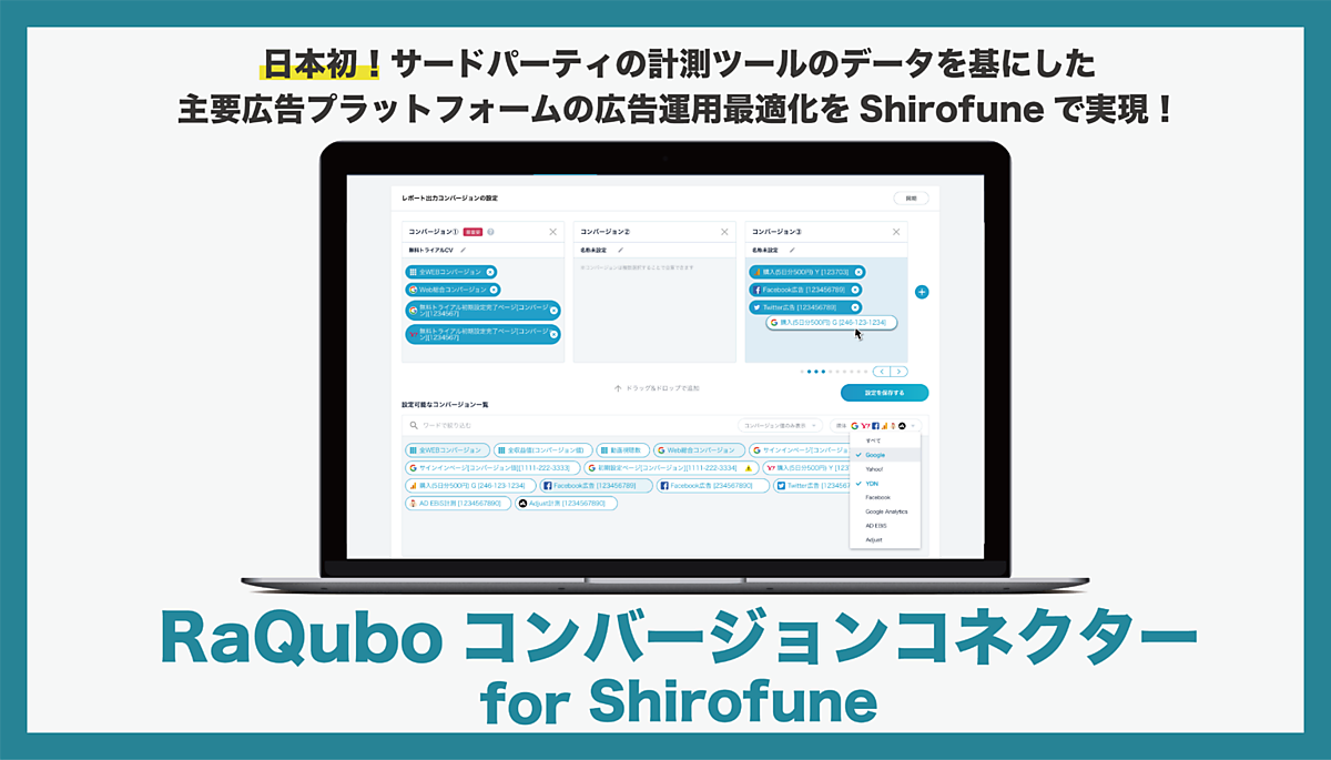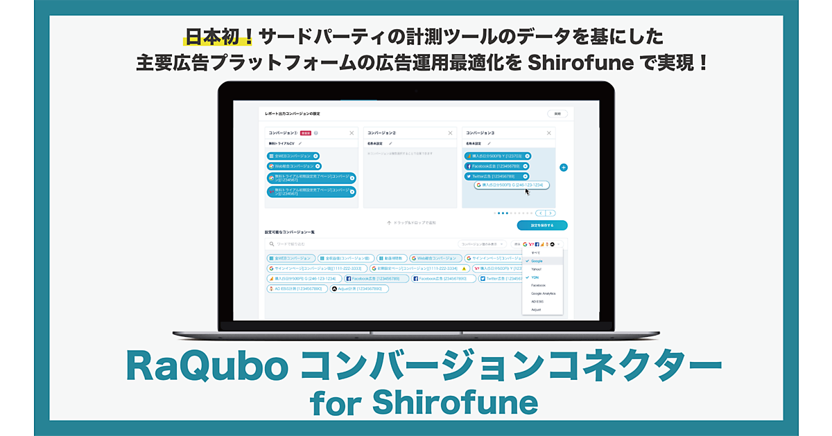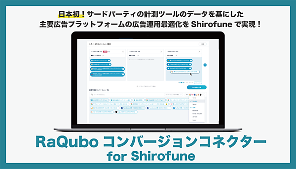 ニーズが高かったアドエビスやAdjustなど各種の広告効果計測・MA(マーケティング自動化)・CRM(顧客関係管理)ツール、管理画面がなくファイルでやり取りしているデータベースとも連携する。業務仕組化・自動化事業のデジタルワークスのRPA(業務自動化システム)ツール「RaQubo(ラクーボ)」が各計測ツールとShirofuneとの間に入ってデータをプッシュする「RaQuboコンバージョンコネクター for Shirofune」によって実現した。