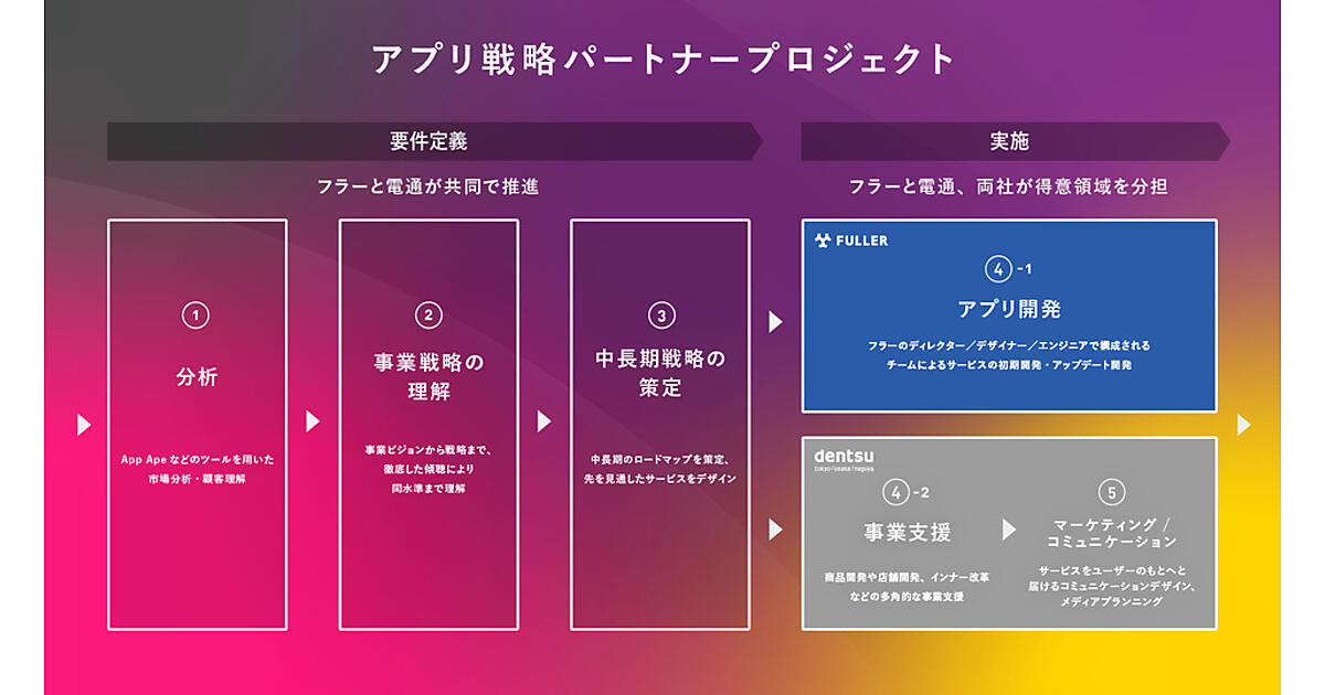 スマートフォンアプリ分析・開発支援事業のフラーは、電通と業務提携してDX(デジタル変革)支援事業「アプリ戦略パートナープロジェクト」を始めた、と9月1日に発表した。アプリを起点に企業のデジタル領域を支援する。フラーのアプリ分析サービス「App Ape(アップ・エイプ)」による市場分析から戦略構築、開発、マーケティング、運用までで提案し、アプリ開発に限定せずビジネス全体に目を配ってDXを支援する。