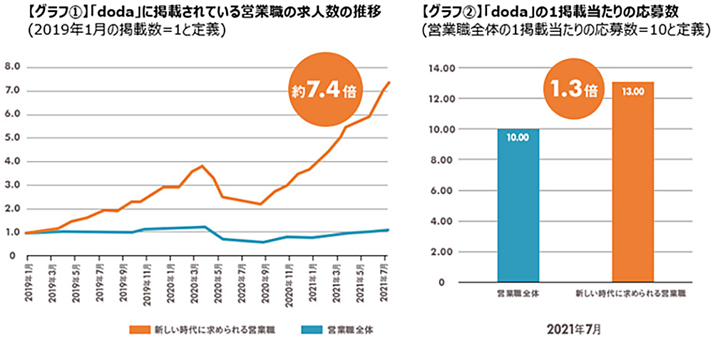 この調査では、2019年1月および2021年7月に「doda」に掲載された、「新しい時代に求められる営業職」の求人(仕事内容欄に「インサイドセールス」または「カスタマーサクセス」の文言が入っている求人)の数を比較した。