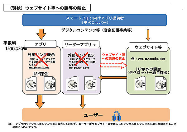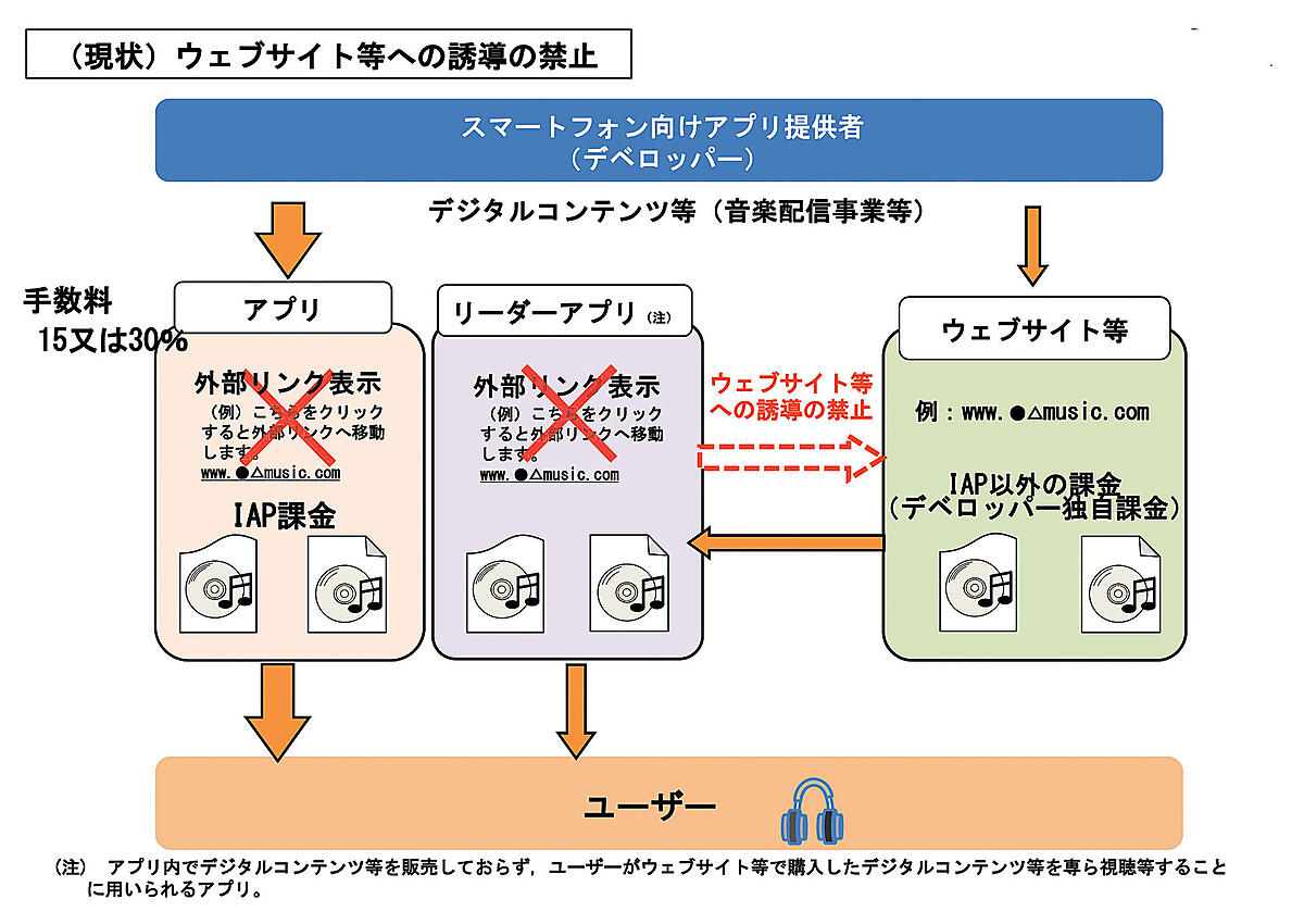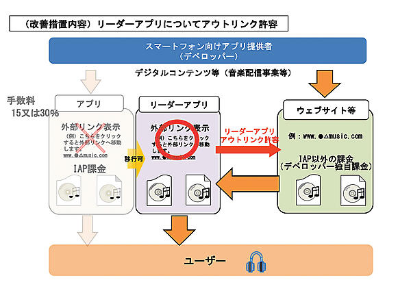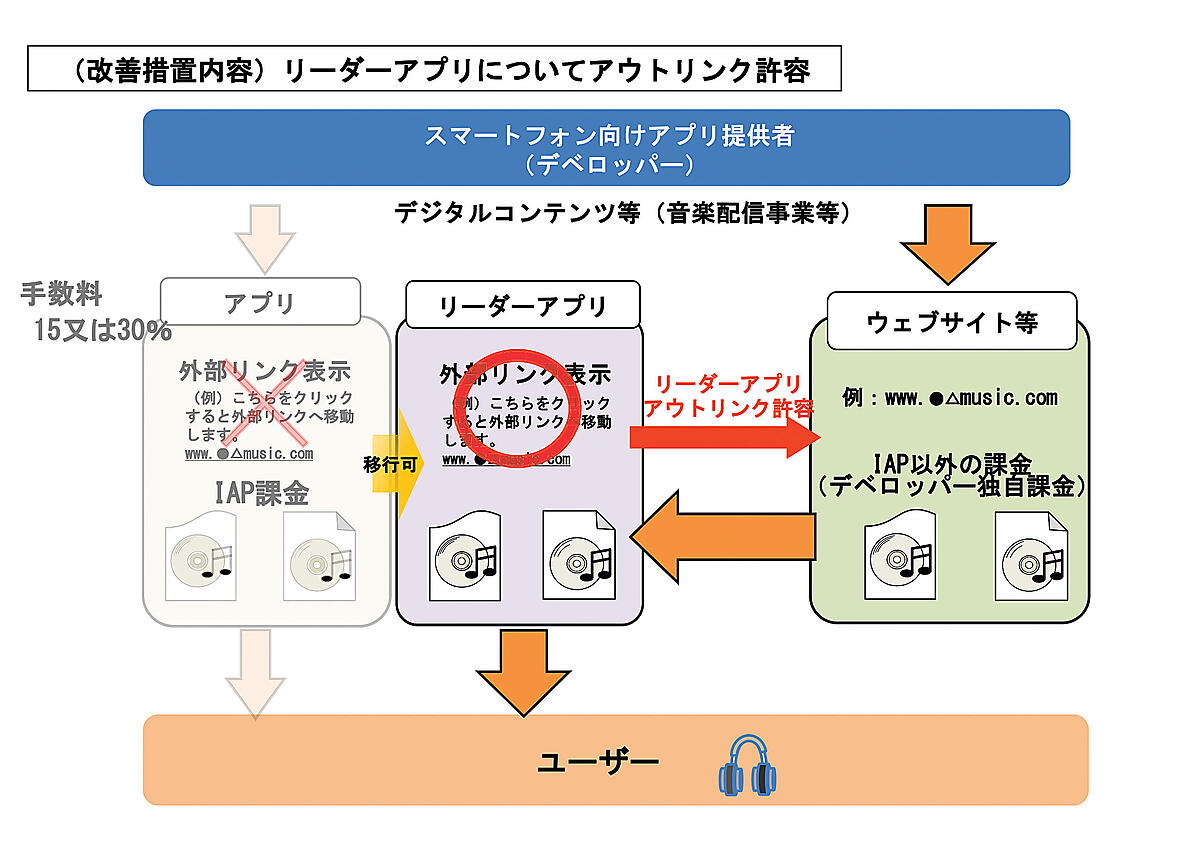 デベロッパーがアプリ内でコンテンツを販売する場合、アップルは指定するアプリ内課金の「IAP」の使用を義務付け、売上に対して最大30%の手数料を徴収してきた。コンテンツ販売でアプリを提供するデベロッパーの事業活動をアップルが制限している疑いで、公取委は独占禁止法に基づく審査を2016年10月から行ってきた。アップルがアプリ内課金以外の購入に誘導するアウトリンクを認めたため、公取委は審査を終了した。
