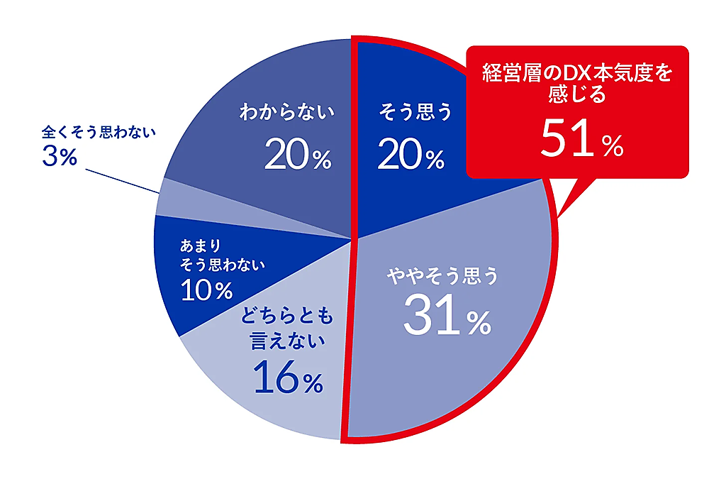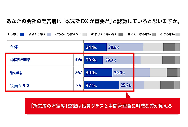 また「自社の経営層は“本気でDXが重要だ”と認識しているか」という設問に対して、「認識している」(そう思う+ややそう思うの合計)という回答は51%で半数を超えたが、中間管理職と役員クラスを比較すると、中間管理職は役員クラスより明らかに低調だった。役員クラスが思っているほど中間管理職は“本気だとは思っていない”というのが現状のようだ。「経営層からのDX方針が明確に出ている」と回答した中間管理職はわずか31%で、職位が下がれば下がるほど方針が伝わっていない傾向がうかがえる結果となった。