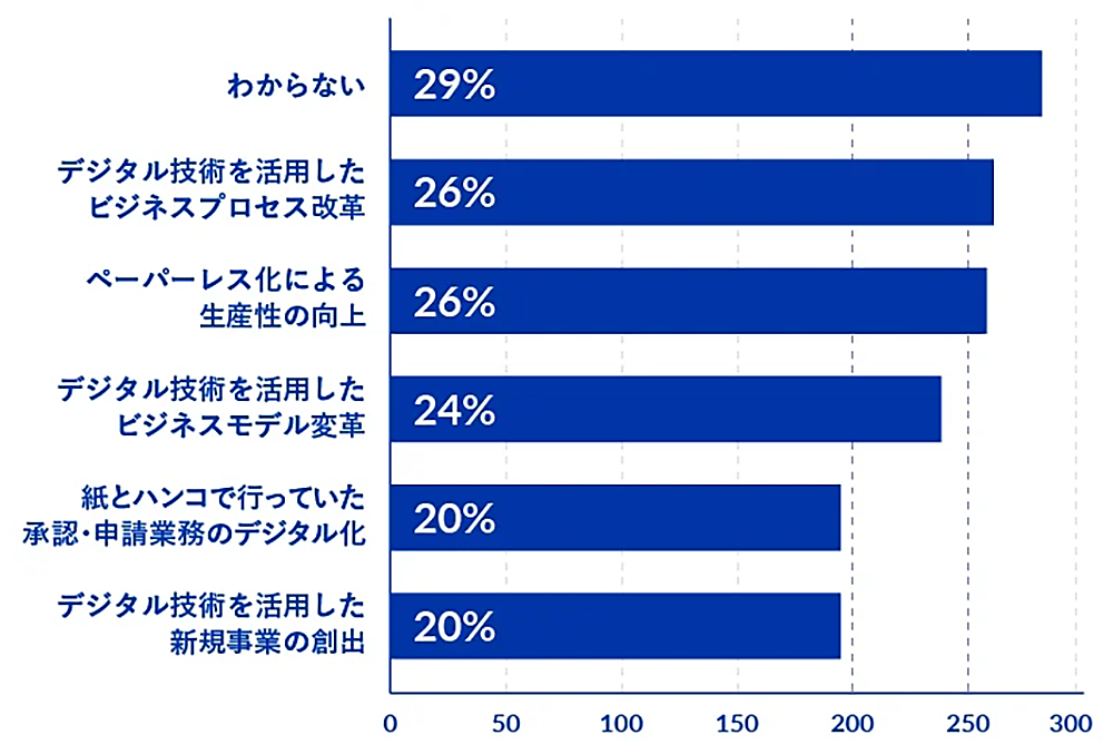 しかし「自社のDX/デジタル化の取り組みにおける最重要テーマ」を聞くと、「わからない」29%が最多で、“なんちゃってDX/デジタル化”がはびこっている現状がうかがえる。2位以下には「デジタル技術を活用したビジネスプロセス改革」「ペーパーレス化による生産性の向上」各26%、「デジタル技術を活用したビジネスモデル変革」24%、「紙とハンコで行っていた承認・申請業務のデジタル化」20%が僅差で並んだ。