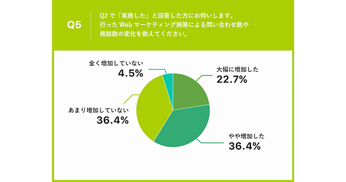 そこで「少なくなった」と回答した102社に「展示会の代わりに商談・問い合わせを確保するWebマーケティング施策を実施しましたか」と聞くと、「実施した」64.7%、「実施していない」35.3%となった。多くの企業で、Webマーケティング施策への“重心移動”が進んでいると考えられる。