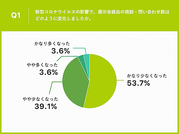 まず「新型コロナウイルスの影響で、展示会経由の商談・問い合わせ数はどのように変化しましたか」と聞くと、「かなり少なくなった」53.7%、「やや少なくなった」39.1%で9割以上の企業で、商談機会が減少していた。