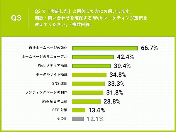 具体的な実施施策を実施者66人に聞くと、「自社ホームページの強化」66.7%、「ホームページのリニューアル」42.4%、「Webメディア掲載」39.4%が上位となった。まずは足下の自社サイトテコ入れが目立つ。これら以外の施策を自由回答で聞くと、「Webセミナー開催」「オンライン展示会への参加」といった回答が多かった。一方で、「Web広告の出稿」28.8%、「SEO対策」13.6%などはやや低めだ。