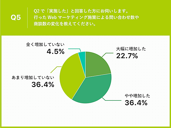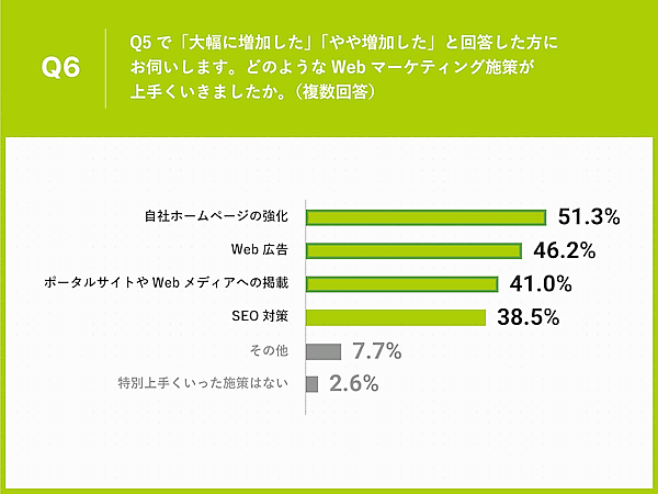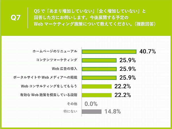 「あまり増加していない」「まったく増加していない」と回答した27人に、「今後展開する予定のWebマーケティング施策」を聞くと、「ホームページのリニューアル」40.7%、「コンテンツマーケティング」25.9%、「Web広告の導入」25.9%となり、こちらも異なる傾向が見られた。