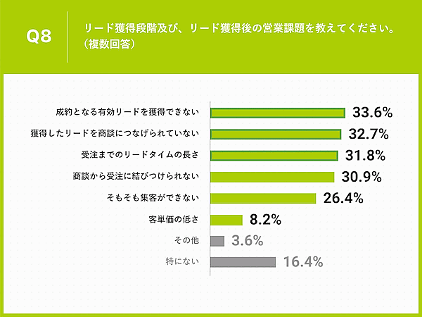 最後に「リード獲得段階およびリード獲得後の、営業課題」を全体に聞くと、「成約となる有効リードを獲得できない」33.6%、「獲得したリードを商談につなげられていない」32.7%、「受注までのリードタイムの長さ」31.8%が僅差で並んだ。こうした点からも自社サイトの状況や商材、新規開拓なのか既存顧客強化なのかといった方針、予算枠など、さまざまな観点で適切な施策を選ぶことが重要と考えられる。
