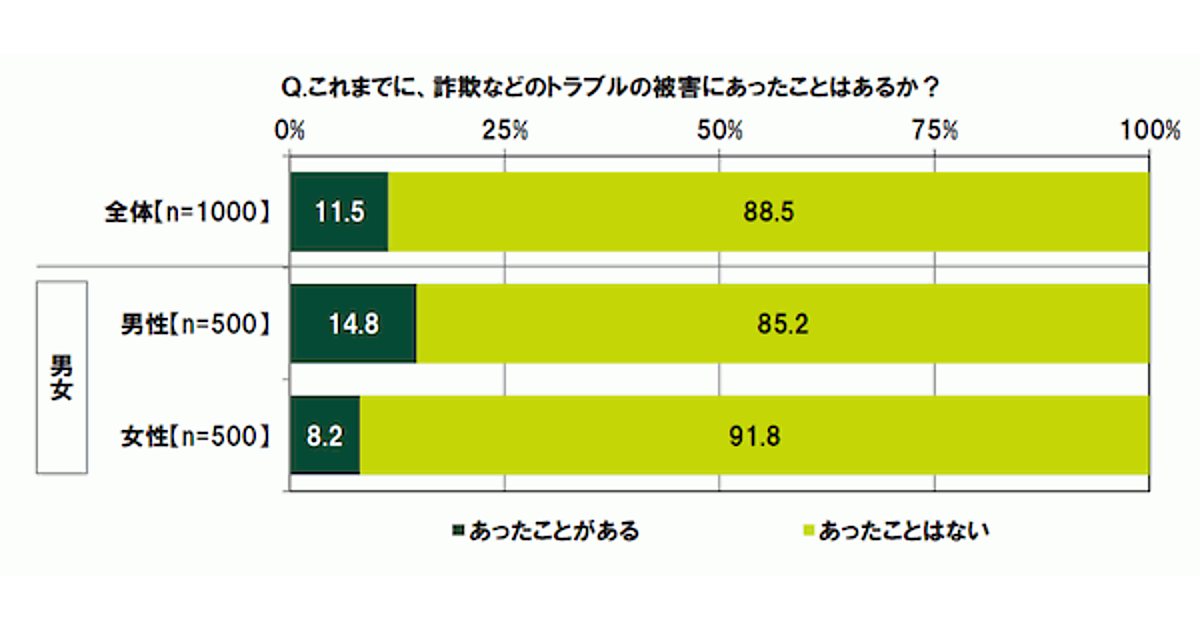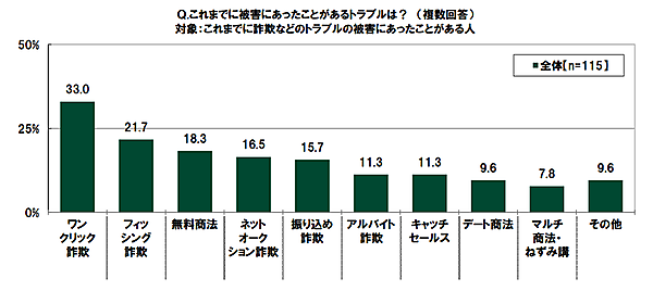 さらに全員に、「これまでに、詐欺などのトラブルの被害にあったことがあるか」を聞くと、「あったことがある」11.5%、「あったことはない」88.5%で、被害者は1割ほど。男性14.8%、女性8.2%と男性のほうがかなり上回る。具体的なトラブル内容では、「ワンクリック詐欺」33.0%が特に多く、以下「フィッシング詐欺」21.7%、「無料商法」18.3%、「ネットオークション詐欺」16.5%、「振り込め詐欺」15.7%が続いた。