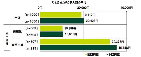 →今回調査10,653円)、大学生等で3,015円増(前回調査32,373円→今回調査35,388円)となっている。コロナ禍真っ最中だった前回調査時期より、かなりの回復が見られる。