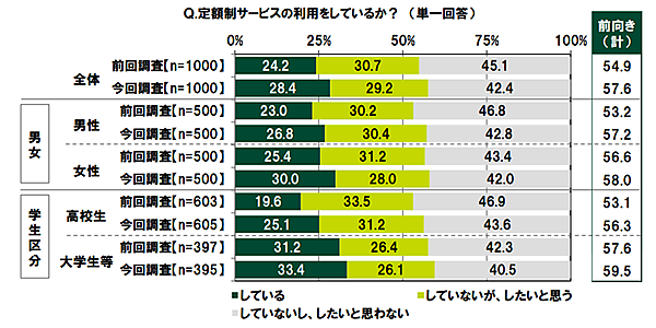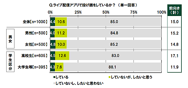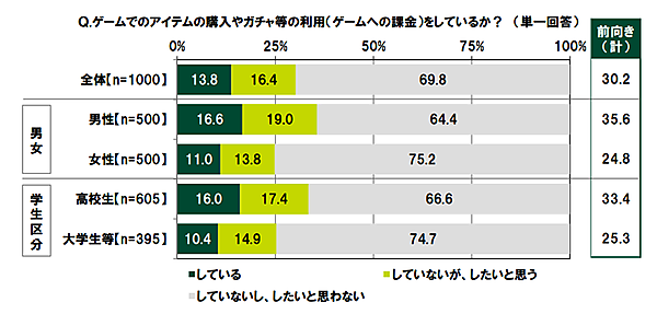 ネットサービスについて、「定額制サービス(サブスクリプション)の利用をしているか」では「している」28.4%、「していないが、したいと思う」29.2%で平均1,387円だったが、「ライブ配信アプリでの投げ銭(リアルタイム配信を視聴した際に、ライブ配信者にお金や換金できるアイテムなどを送ること)」は、「している」4.4%、「していないが、したいと思う」10.6%で1割台にとどまっている。平均は2,010円だった。「ゲームでのアイテムの購入やガチャ等の利用(ゲームへの課金)」は「している」13.8%、「していないが、したいと思う」16.4%。男性は「している」16.6%と、女性の11.0%と比べて5.6ポイント高く、高校生は「している」16.0%と、大学生等(10.4%)と比べてこれも5.6ポイント高い。平均は2,058円だった。