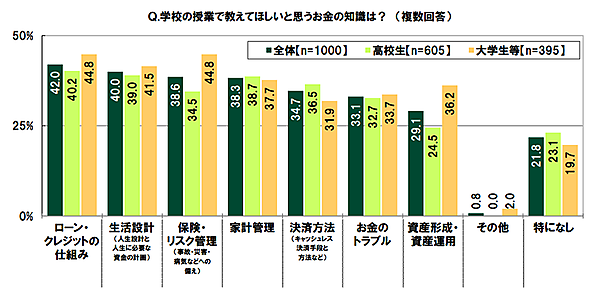 一方、「学校の授業で教えてほしいと思うお金の知識」では、より実生活に密着した内容として、「ローン・クレジットの仕組み」42.0%、「生活設計(人生設計と人生に必要な資金の計画)」40.0%、「保険・リスク管理(事故・災害・病気などへの備え)」38.6%、「家計管理」38.3%、「決済方法(キャッシュレス決済手段と方法など)」34.7%が上位となった。