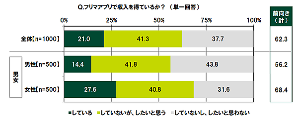 アルバイト以外の収入源として「フリマアプリ」で収入を得ているかを聞くと、「得ている」21.0%、「得ていないが、得たいと思う」41.3%で、6割以上が積極的な利用意向を示した。男女別では女性68.4%、男性56.2%で、女性のほうがやや高い。