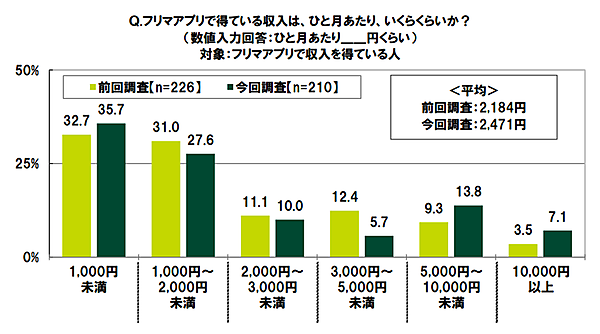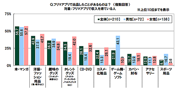 実際にフリマアプリで収入を得ている210人に、「フリマアプリによるひと月あたりの収入金額」を聞くと、平均2,471円(前回調査2,184円)だった。具体的な出品アイテムでは「本・マンガ」56.7%、「洋服・ファッション用品(靴・帽子など)」42.9%、「趣味のグッズ(フィギュア・楽器など)」36.2%、「タレントグッズ(アイドル・アーティストのノベルティグッズなど)」34.3%が上位だった。